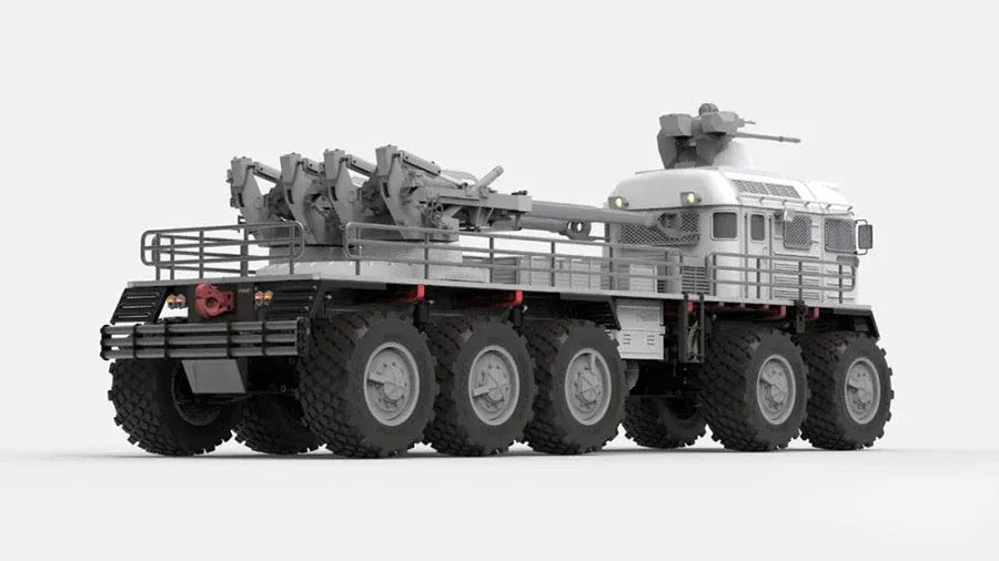 Both groups can rotate infinitely, and the double-barreled howitzer is also equipped with a hydraulic lifting system.